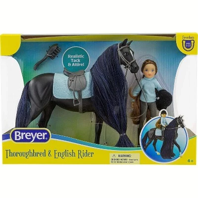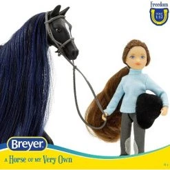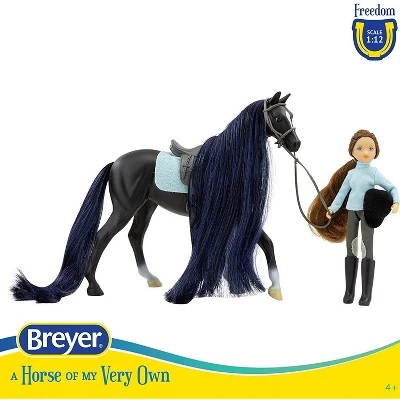 Another fun and new addition to our Freedom Series sets is Jet and the English Rider, Charlotte. This set includes Jet, a Black Thoroughbred Horse with silky black and navy colored mane & tail, and Charlotte, a 5.75โ articulated English rider, her outfit complete with riding helmet, saddle pad, English saddle, bridle, and brush. A great playset for hours of hair brushing fun!