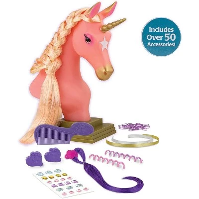- INCLUDES OVER 50 ACCESSORIES: Set comes with Stardust unicorn styling head, hair comb, 2 barrettes, 2 hair coils, 2 satin ribbons, hair extension, 30 hair bands, and jewel sticker sheet.
