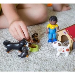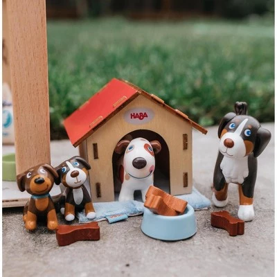 - Set includes: 2 puppies (measuring 1.75″ tall), soft blue blanket, plastic dog basket and 3 frisbees. Enjoy HABA’s Little Friends puppies on their own, or along with their mama, Dog Leika #304750 (sold separately).