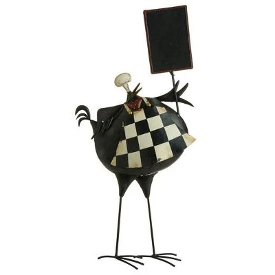 Makes a great menu board for your restaurant or bistro, your kitchen or anywhere in your home! Bistro bird features a weathered finish and is wearing a black and white checkered chefs apron He holds a chalkboard made with durable chalkboard paint made to last Dimensions: 31.75″H x 14″W x 3″D Material(s): tin Note: chalk not included